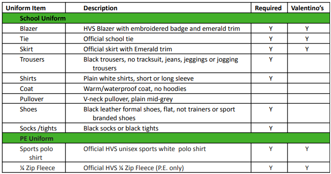 You can order items of uniform directly from the Valentino’s website for free delivery direct to school on their weekly delivery service, or they can deliver to your home address for a small charge. Alternatively, you can of course visit their shop in person. You can view the full range of HVS uniform on the Valentino’s website here.